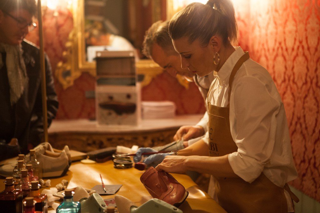 Con lui i nostri Maestri Antonio e Paola, impegnati nel lavoro di tamponatura a mano – con i colori naturali di scotano e mallo di noce – su nuovi modelli di scarpe sportive che FABI presenterà a PITTI IMMAGINE UOMO 93.